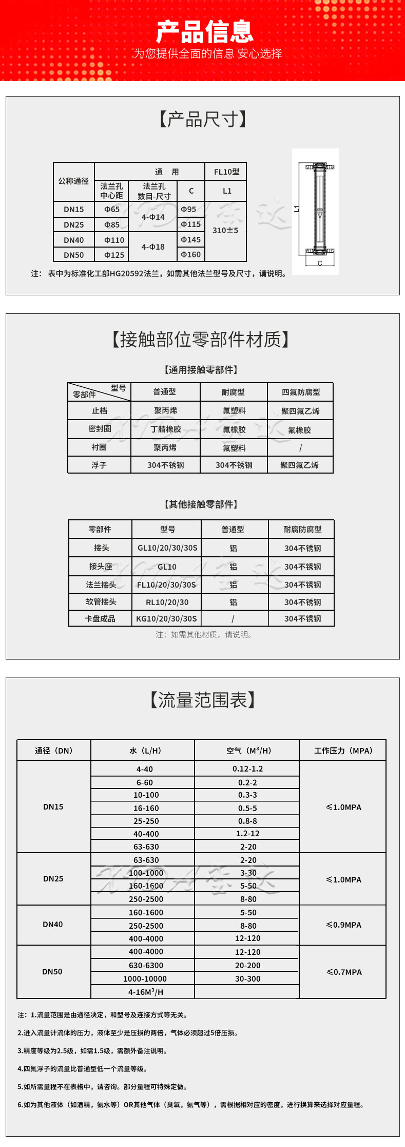 5. 延伸:FL10-15玻璃轉(zhuǎn)子流量計(jì)是一款可測(cè)普通介質(zhì)的流量計(jì)。如需耐腐型流量計(jì),可選擇FL10-15F(接液耐腐)或FL10-15B(整體不銹鋼)或FL10-15FO(襯四氟流量計(jì))。連接方式還有其它選擇:螺紋連接,軟管連接,卡盤(pán)連接。